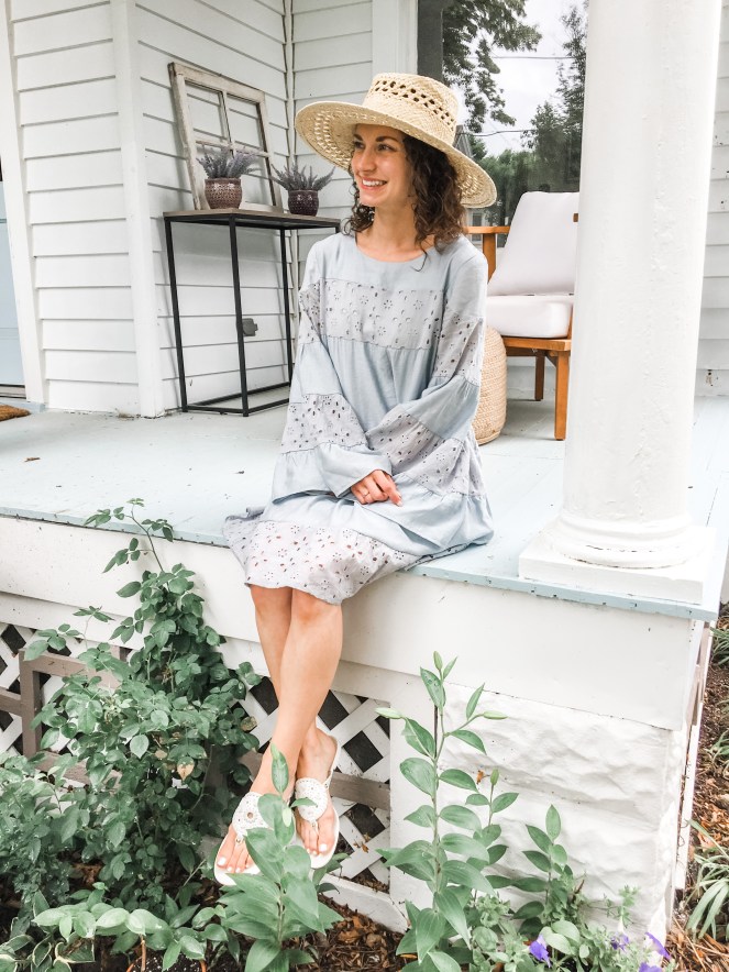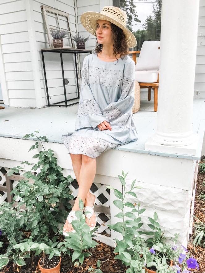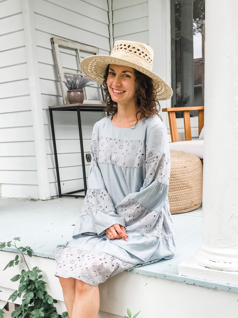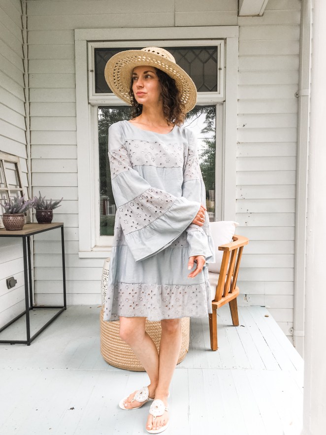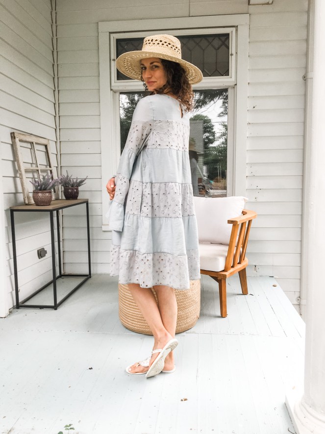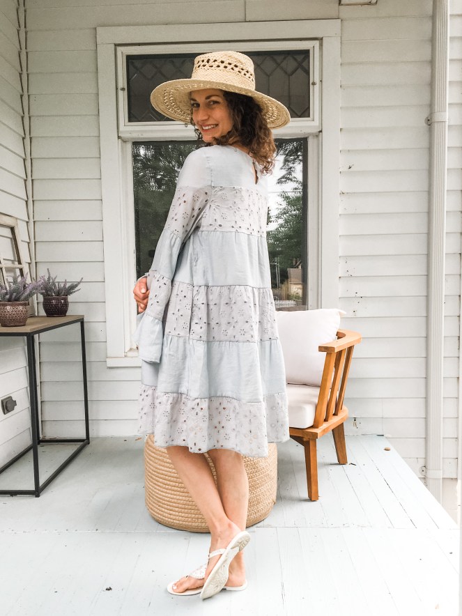 I am in love with the Chloe Dress! It’s a simple swing dress with large bell sleeves. I was worried the voluminous shape would be too overwhelming on my petite frame but it fits great! The length is perfect for petites and moms (hitting me just above the knee). The shape is also very comfortable. The eyelet panels are a pretty addition to this dress and they take it from a very simple design to something that is higher quality. The eyelet panels are fully lined except for in the sleeve and the hem panel. For reference, I am 5’0″ tall and 90lbs.