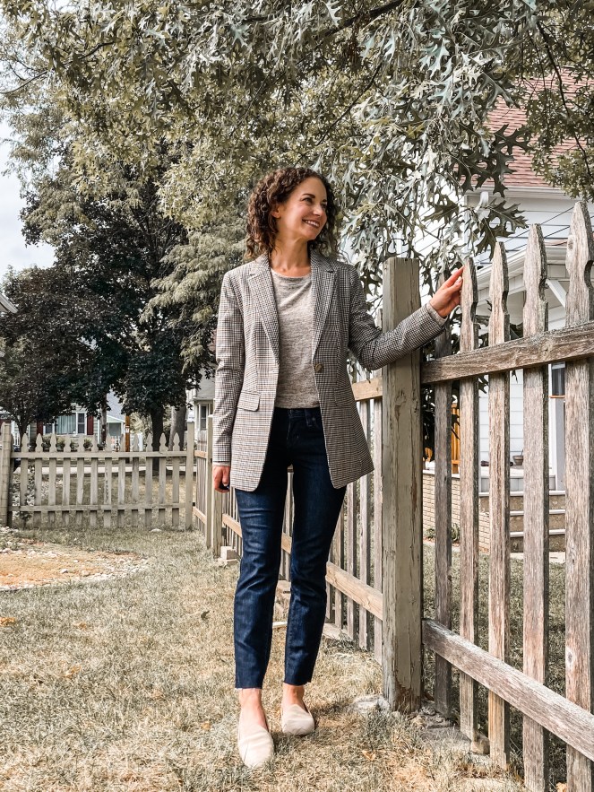 A Fall staple that should be in everyone’s closet is a classic plaid blazer, especially for moms. Nothing says “Fall” more to me than plaid! A blazer is a wonderful piece that adds polish to any outfit you have on. For example, I paired mine with a simple tee, straight leg jeans (similar here, here and here), and my favorite Birdies and the look comes together by popping on a blazer! It’s simple and classic.