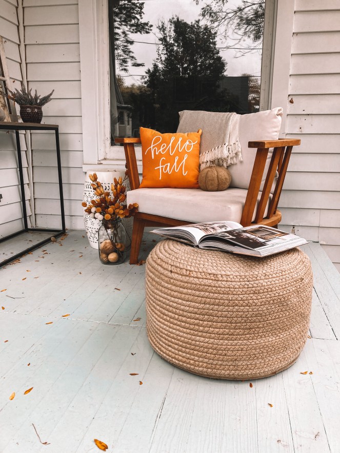 - Add little Fall touches to your space! You don’t have to have your porch overrun with pumpkins and wheat stalks. Having too much on your porch can make the space unusable and feel overwhelmed. I like to add small pieces, like a cute Fall pillow to my chair and a few pumpkins scattered about, to accent the area and make it feel festive.