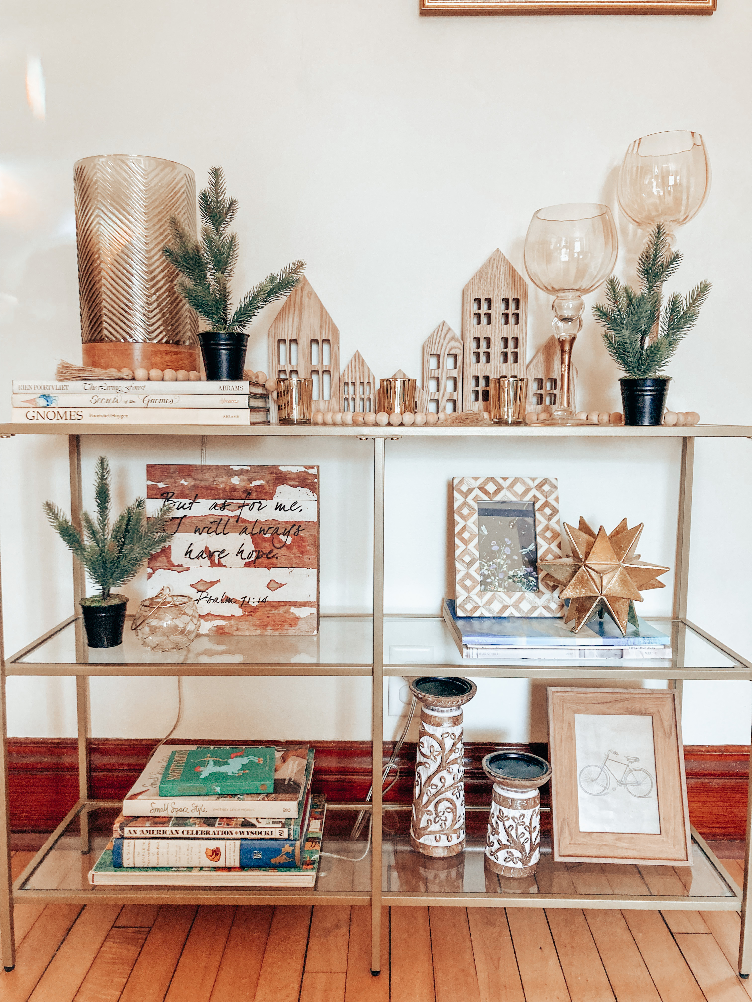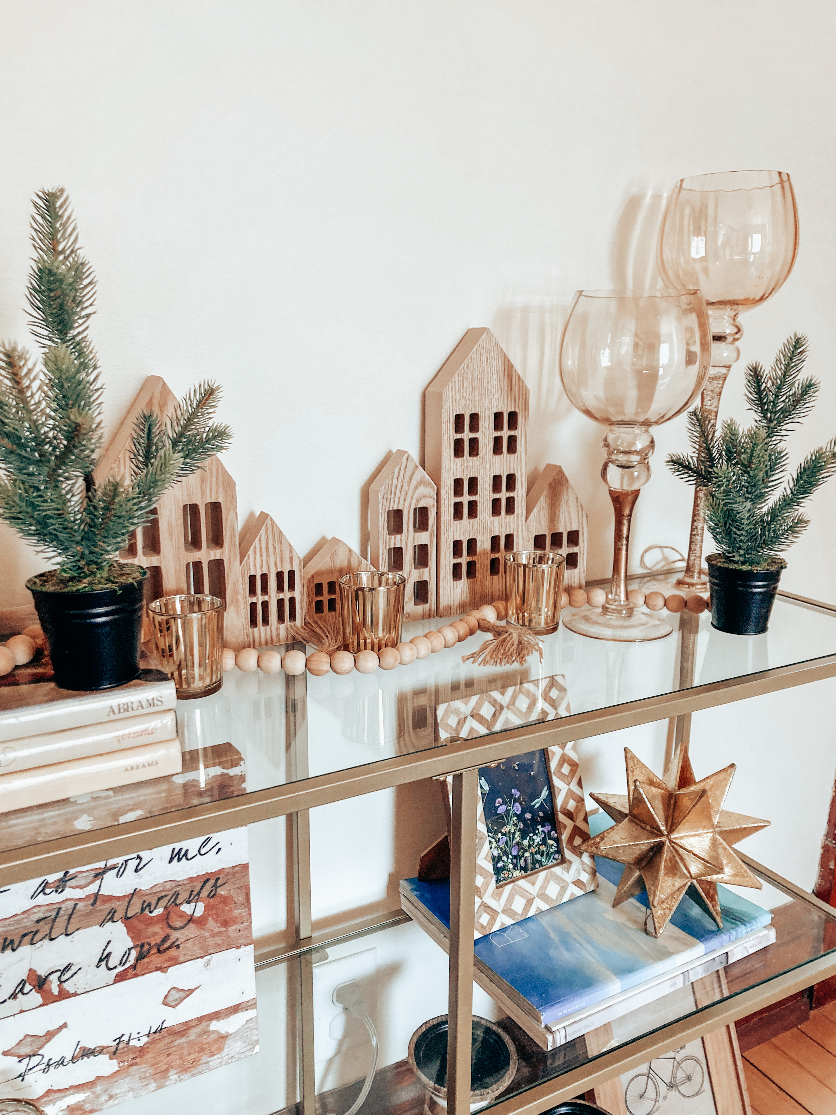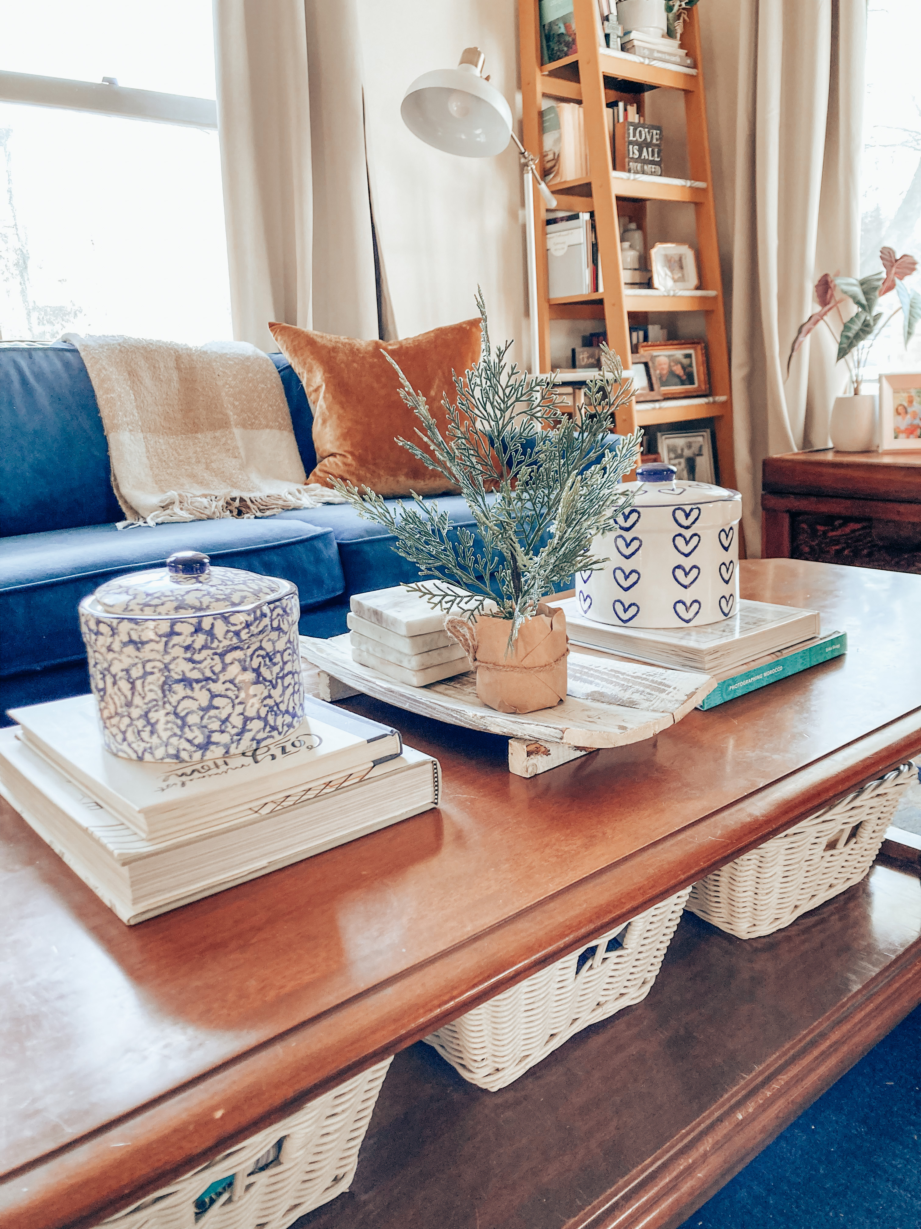 - Add in seasonal greens- Place mini faux pine trees in your space to pay homage to winter and to also add in that pop of green that instantly livens up a space! Adding seasonal greens to a coffee table, bookcase, etc. makes a home feel cozy and inviting.