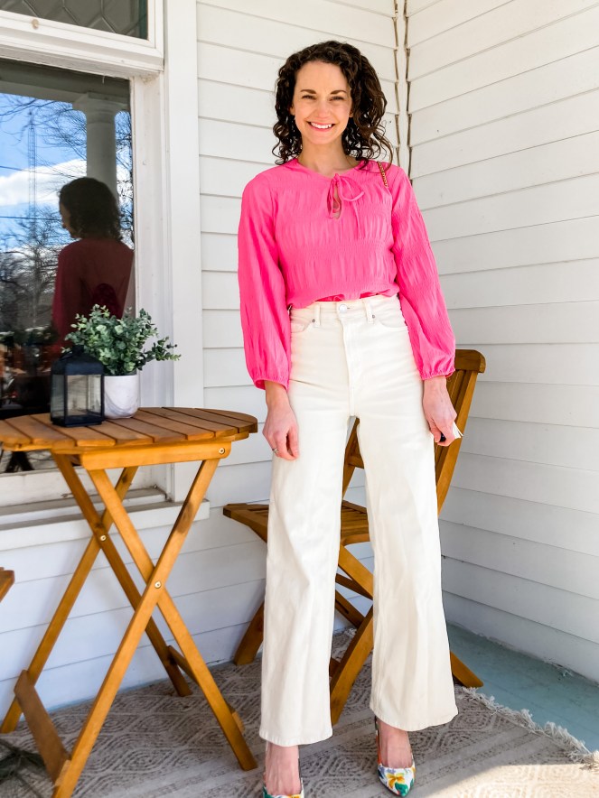 The bright color of the Vince Camuto Textured Blouse is a must have for Summer! I love that this can be dressed up for work and down for the weekend.