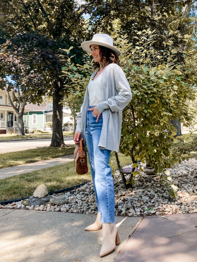 #4. Pairing a classic cardigan with wide leg jeans and booties is always a good idea!