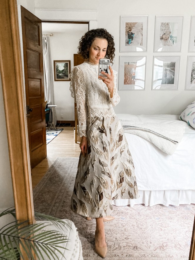 Chicwish Golden Leaves Jacquard Midi Skirt, wearing size XS, fully lined, very full skirt, order your usual size