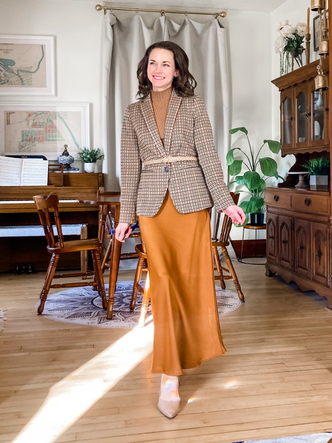 In this first look for work, I styled this satin midi skirt with a matching tank top and a plaid blazer. I belted the blazer with a leather braided belt to define my waist. I finished off this look with a classic neutral pump that is comfortable and perfect for the office.