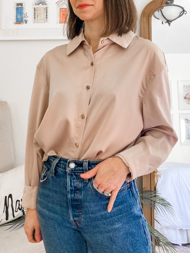 #4. Chicwish V Neck Satin Smock Top– wearing size S, loose fit, cuffs rolled for a petite fit, order your usual size