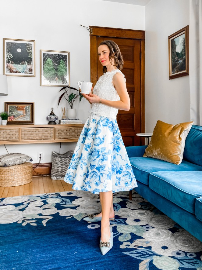 Chicwish Blue Watercolor Peony Flare Midi Skirt– wearing size XS, order your usual size