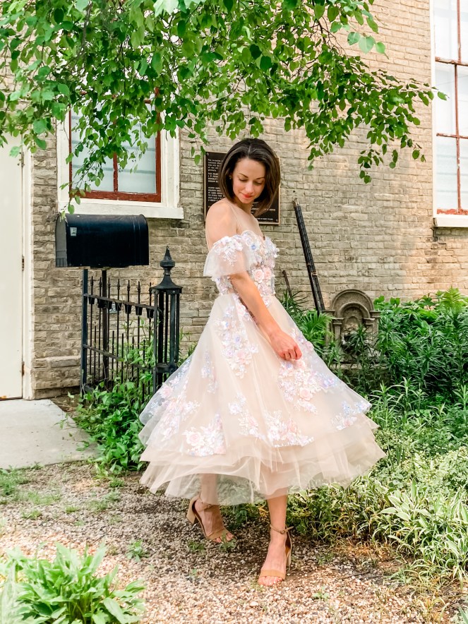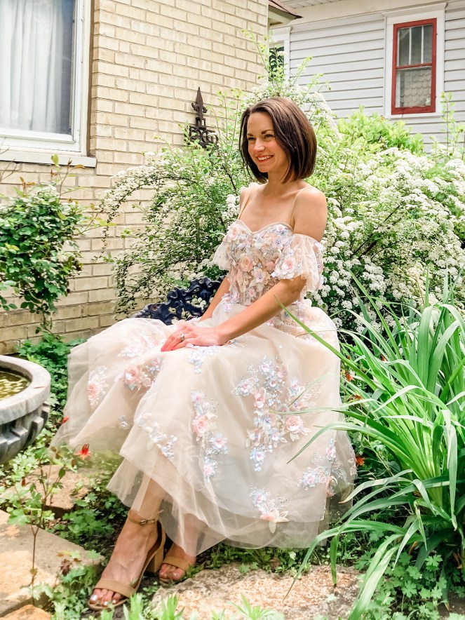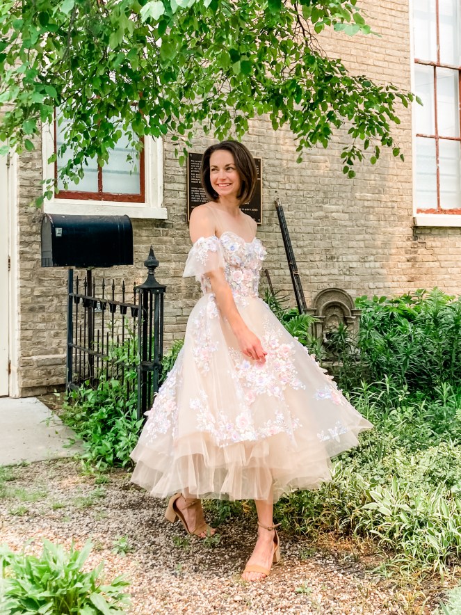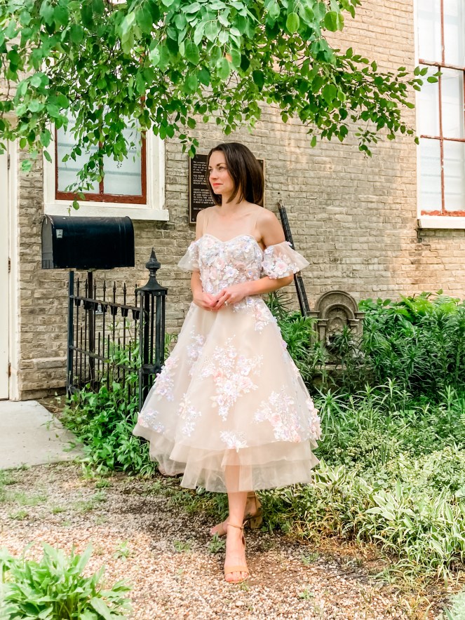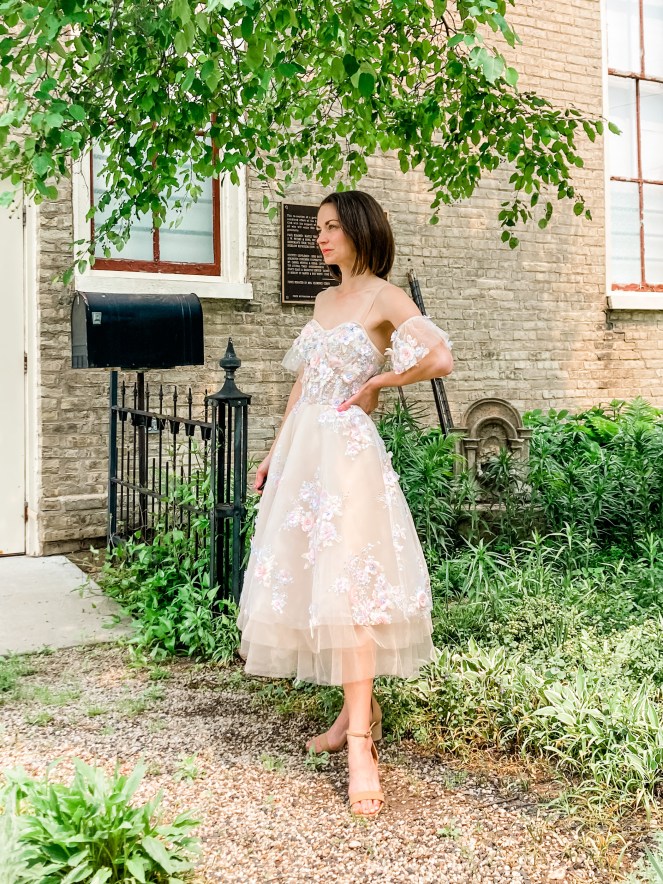 I’m wearing the Maureen Dress in size 0. This dress fits well on me and I would recommend ordering your usual size (for reference, I am 5’0″ tall and 95lbs). The Maureen Dress features a semi sheer corset top with a built in bra, spaghetti straps, off the shoulder straps that are removable, a multi layered tulle skirt that is very fun to twirl in, and tulle and beaded loose flowers allover. This dress is only $89.99 and is 15% off with code Caitlin15 (this code can be used for anything on AW Bridal’s website).