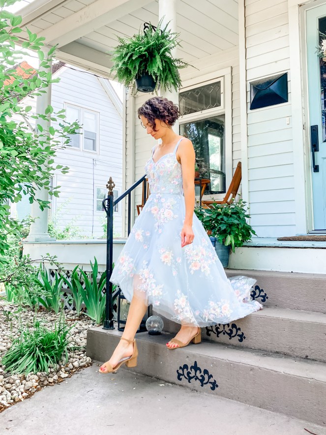 The Marsha Dress makes a stunning wedding guest dress that makes you feel like a princess when you’re wearing it! It has tulle and beaded 3D flowers all over, a hi-low hem and a corset bodice. I’m wearing size 0 and would recommend ordering your usual size. For reference, I am 5’0′ and 95lbs.