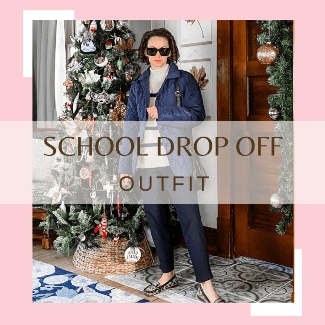 School drop off can be a challenge in the morning. You have to get the kids packed, ready and out the door on time- and don’t forget yourself! I believe it is always important to make sure you are presentable, even when it’s early and you’re rushing. A way to achieve this is by having a classic wardrobe that is comfortable and can be thrown on quickly. An easy look I always love is a cozy stripe sweater, pull on trousers, a quilted jacket, comfortable loafers and a chic pair of sunglasses. Simple and casual chic!