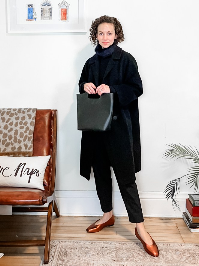 I paired these Birdies The Crane Copper Leather flats with a vintage cashmere coat (linked similar here, here and here), a classic black turtleneck sweater, my favorite black trousers, and a simple black leather bag.