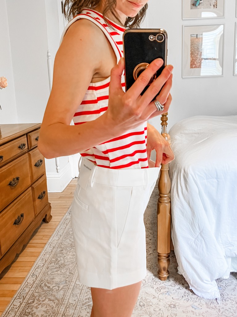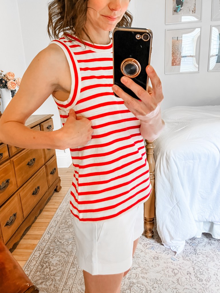 First, I tried on the Petite Striped Harbor Tank Top in size XXSP. Overall, I thought the top fit true to their size chart. The length was flattering on my petite frame and I was especially impressed with the armhole drop. Most tops have a very long armhole drop that will expose your bra, which is then exacerbated on a petite frame. This armhole drop was a great cut and did not show my bra at all!