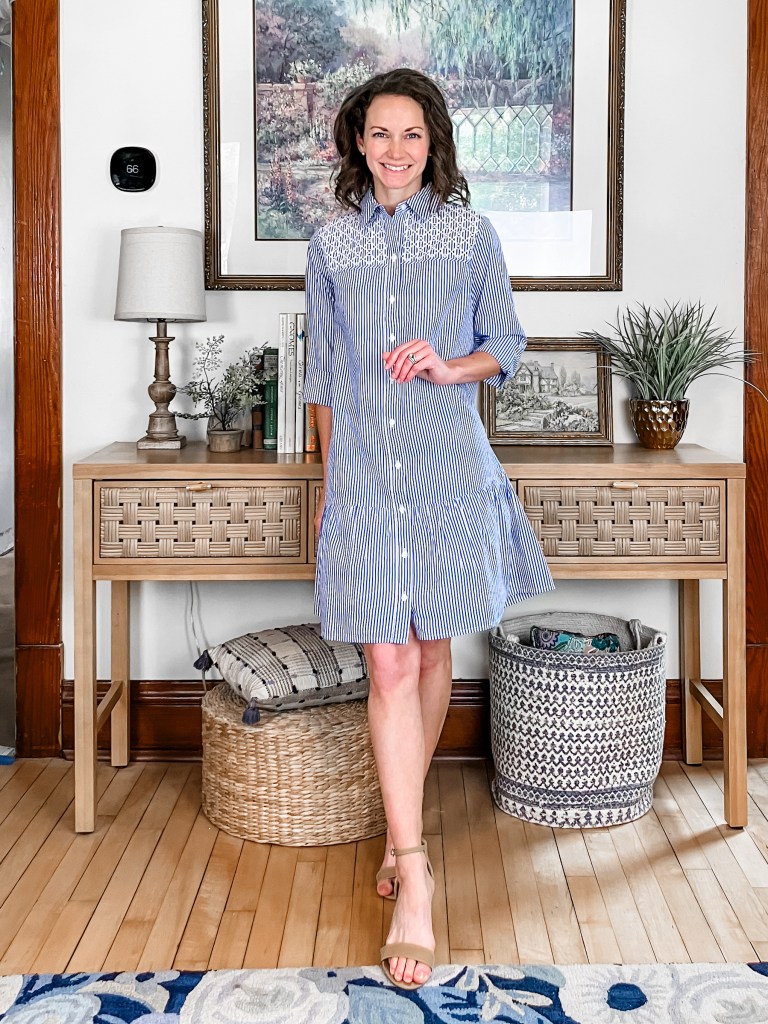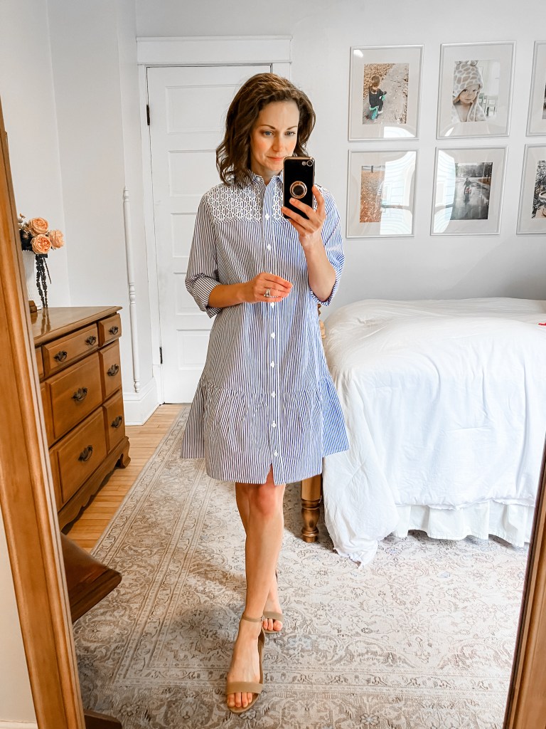 Lastly, I chose to try on the Petite Striped Poplin Pleated Yoke Shirtdress in size XXSP. I knew this dress had a loose shape and I thought it would be ok because the length looked short on the model. On me, though, the dress was too long and looked frumpy. Loft’s petite fit is based on a 5’4″ model and I think this dress would be better suited on someone of that height. On my 5’0″ frame though, not great.
