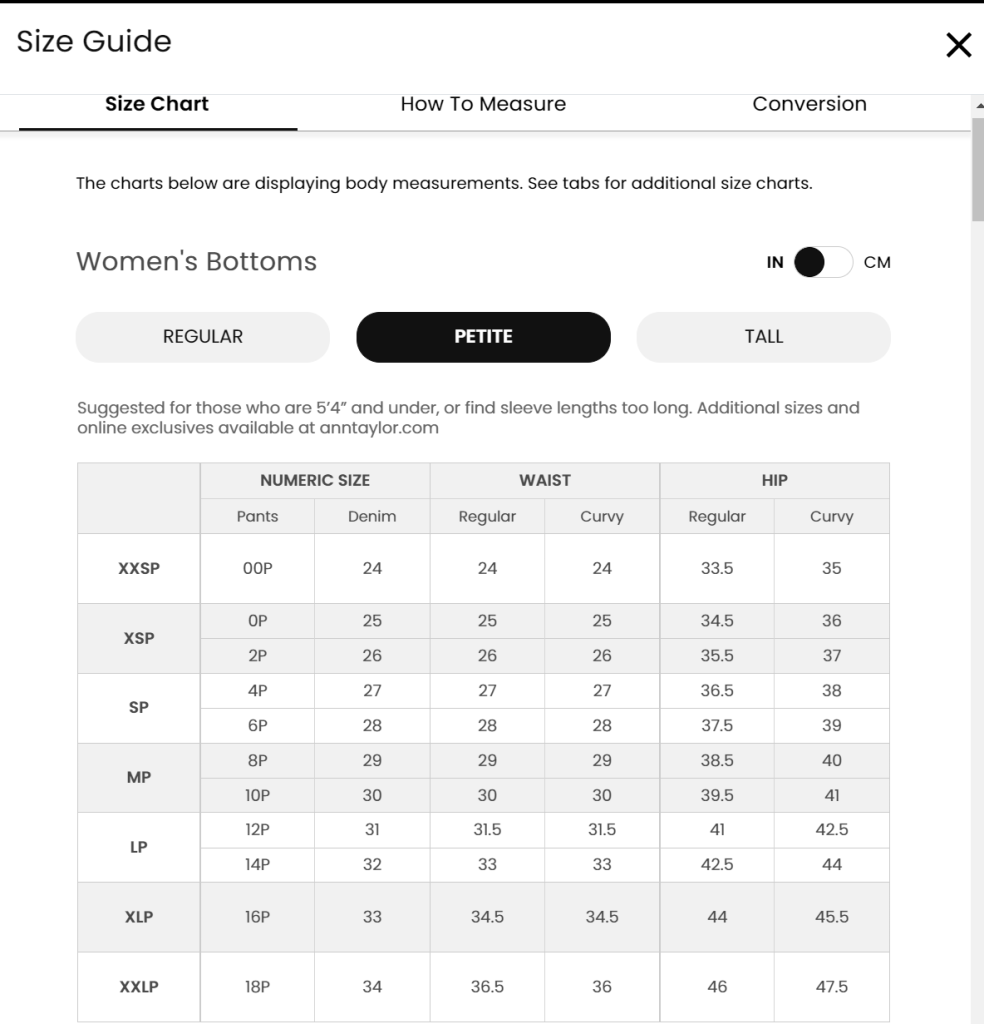 Overall, Loft has a fairly accurate petite size chart for tops and dresses. For bottoms, though, they could use an update to more accurately reflect their garments compared to their size chart.