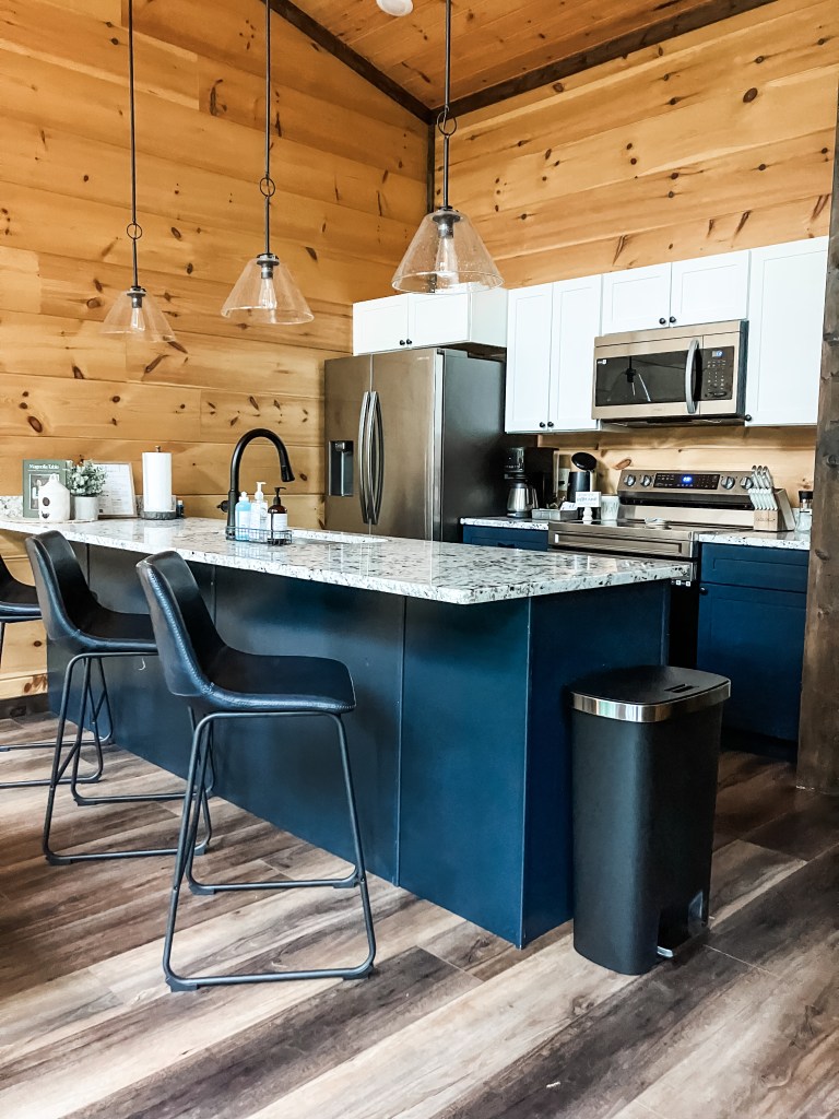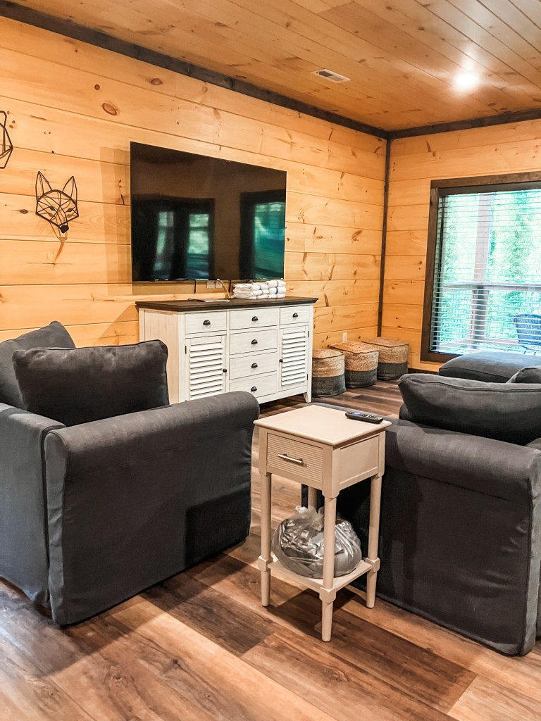 We stayed at Theo’s Treehouse and it was a great Airbnb! This cabin is in a mountain valley, was extremely clean, had a lot of amenities and is a 5 minute drive to downtown Gatlinburg. This is the main floor that had the living room, dining room, kitchen, master bedroom and bathroom, and the upper deck.