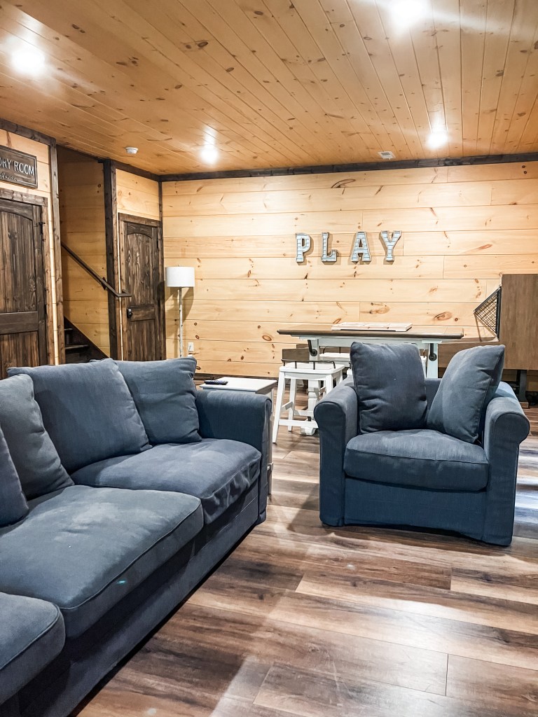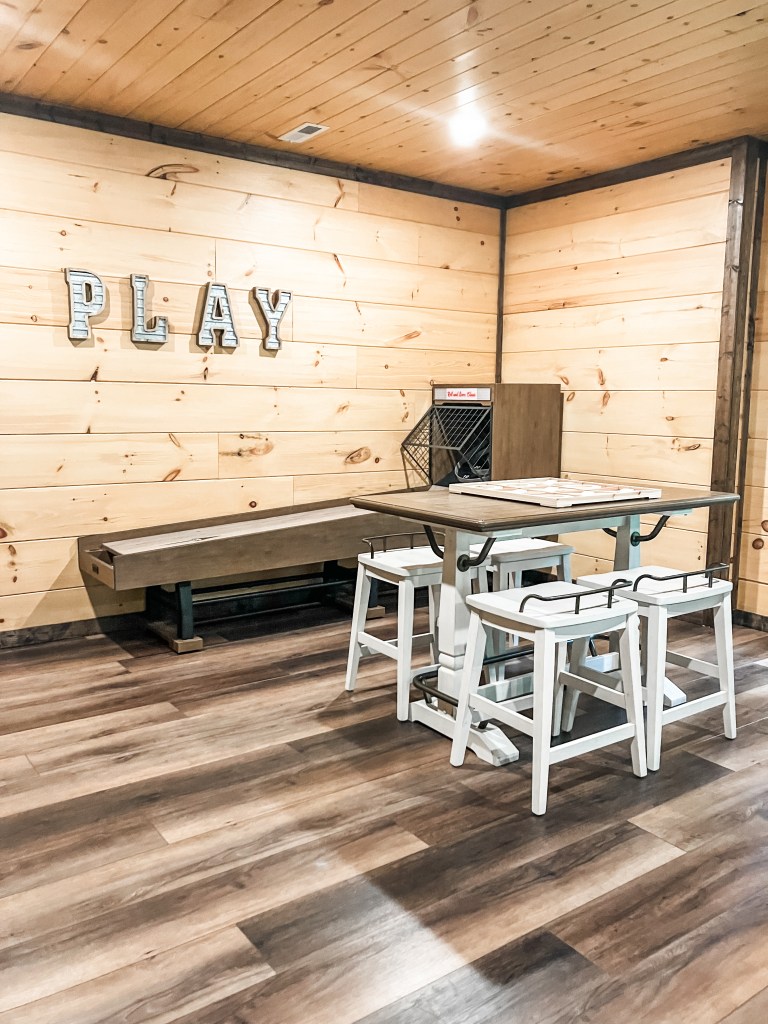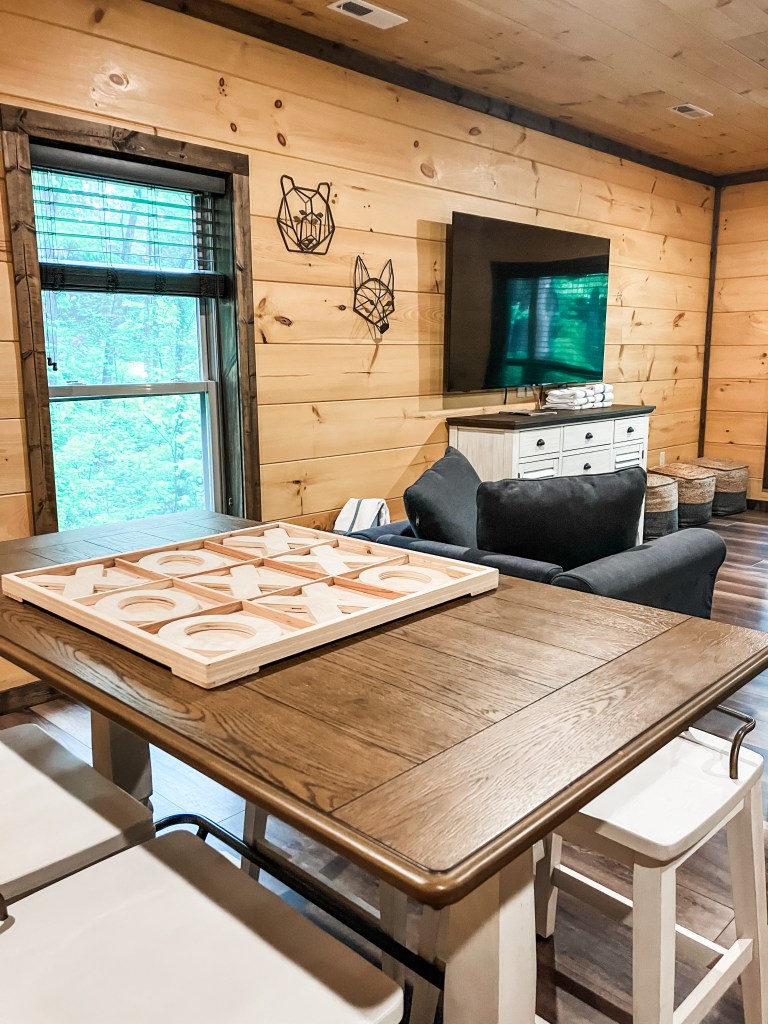 The lower floor was one large room that had fun games (Clay especially loved the ski ball machine- thankfully the balls were rubber!), living space, bunk bed, bathroom, laundry room and the lower deck with a hot tub outside. This cabin was very nice, family friendly and we would definitely stay here again!