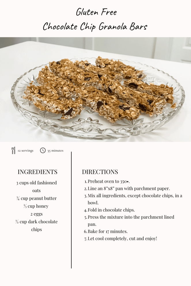Another family favorite in our home! These chocolate chip granola bars are simple to make, super yummy and are gluten free! Here’s the recipe: