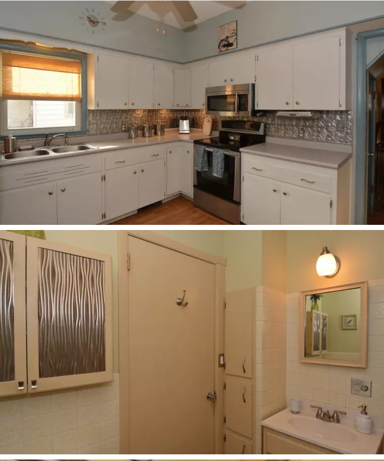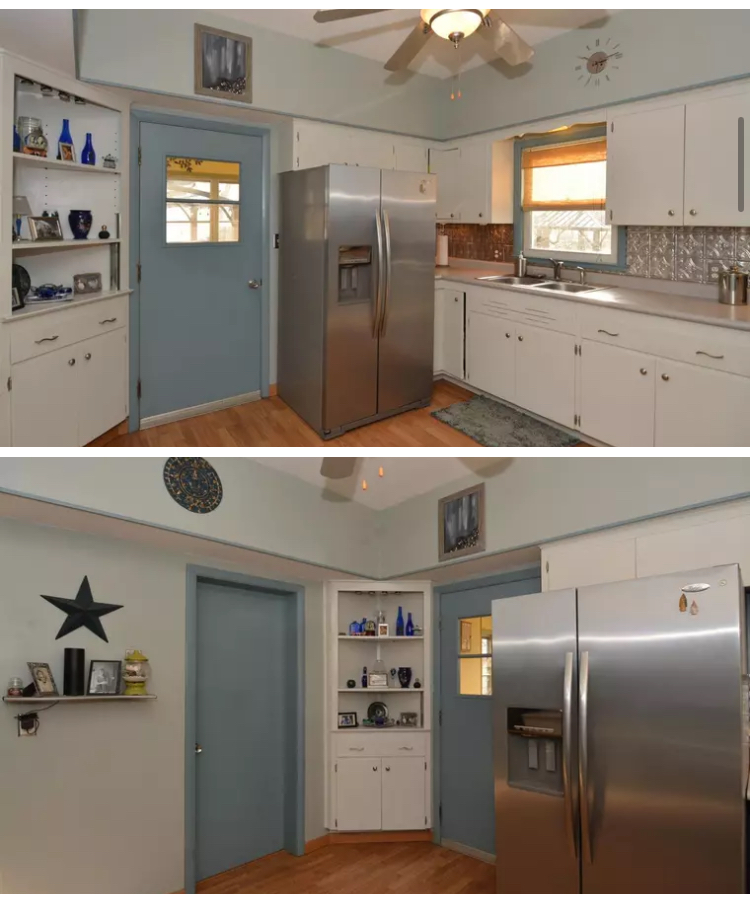 This kitchen also featured soffits, poorly painted cabinets and appliances that looked ok but the fridge would leak and we wanted a gas stove instead of this electric one. The window above the sink was also impossible to open unless I stood on the counter and yanked it open. And the ceiling fan contained about an inch of grease covered dog hair on top of the blades- yuck!