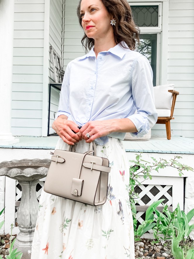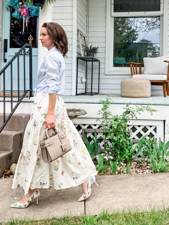 I thought is would be fun to pair this skirt with a light blue button up (similar here), my favorite Le Tanneur Emilie bag, daisy earrings I got from a local artist (similar here from the same artist) and floral heels (similar here).