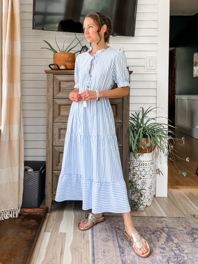 #2. For the next look, I chose to wear my Jack Rogers Sport Sandals with this pretty blue and white stripe dress from Amazon and my Be An Infinite Warrior bracelets again. Simple and comfortable!