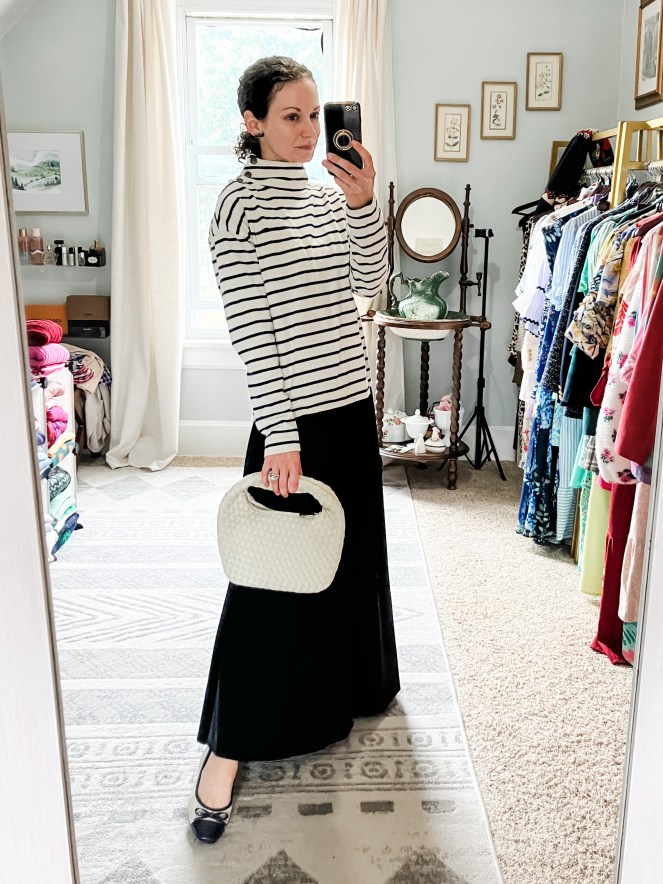 #4. The second I put this outfit together I was obsessed! There’s something about the black sweater, stripe skirt, ballet flats and trench coat that looks like a classic, Parisian chic outfit.
