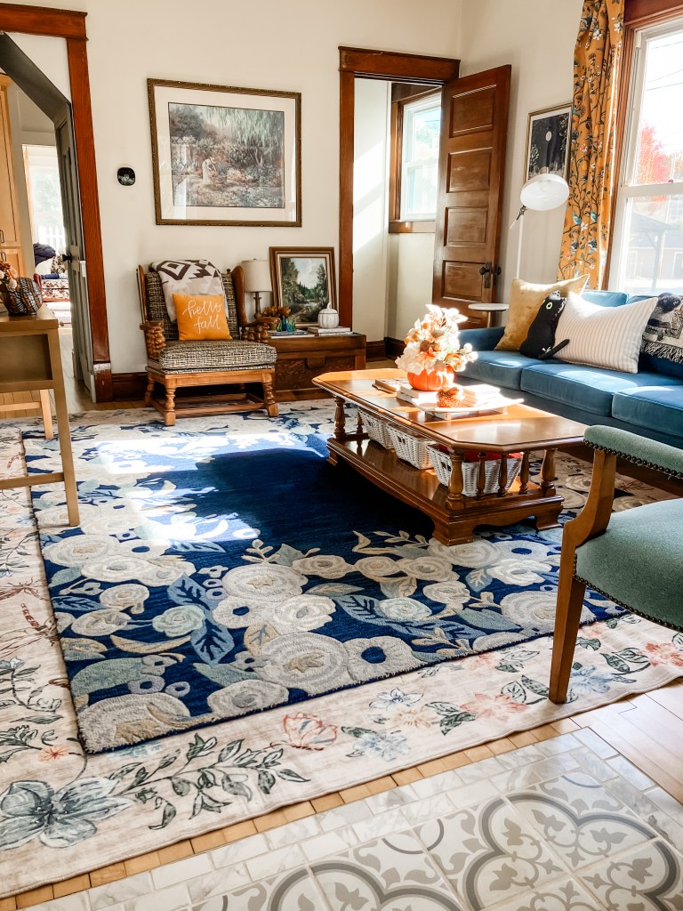 These rugs are in my living room and I love how this mix has turned out! One of the things to consider when layering rugs is the size difference. The best ratio to have between the two sizes is about 2′. For example, if the top rug is 8’x10′ the bottom rug should be 10’x12′. This creates a 12″ border around the top rug.