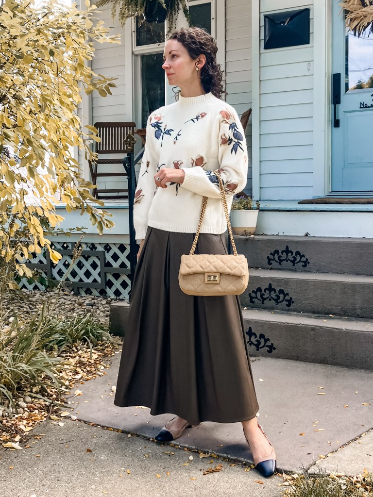 You could also pair a leather skirt with a pretty floral sweater, classic bag and neutral shoes. This is an elegant and neutral look that’s also comfortable!