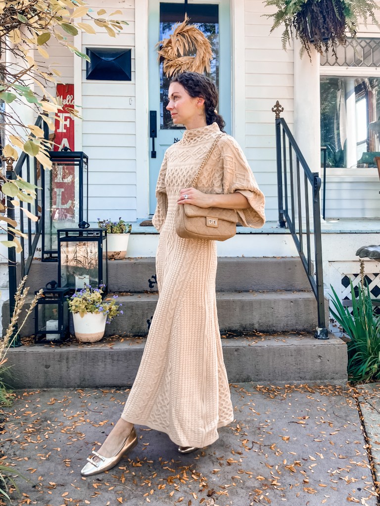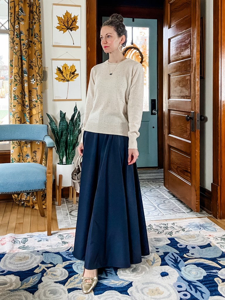 Or maybe you prefer cool tones instead of all of the browns, blacks and beiges? Pairing a navy skirt with a luxurious beige sweater, neutral bag, elegant earrings and necklace, and gold flats is a simple and pretty look for Thanksgiving.