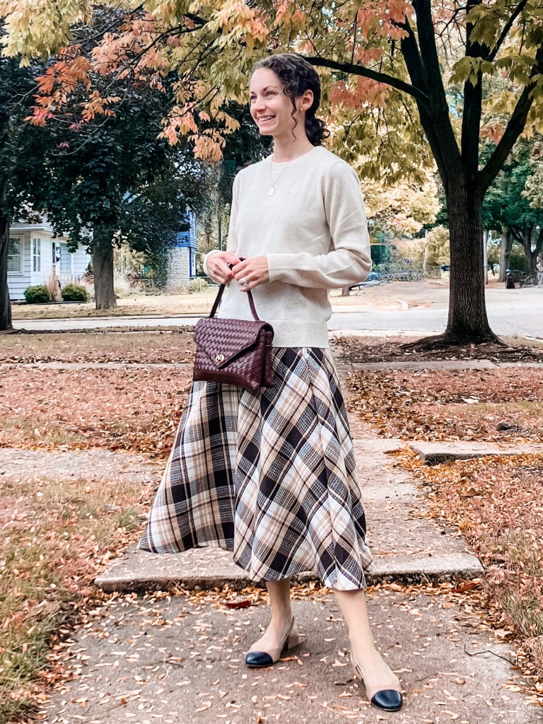 Maybe you want something a little more festive? A plaid skirt is perfect for Thanksgiving! Wearing a plaid skirt with a luxurious beige sweater, woven bag and neutral shoes makes a comfortable and elegant seasonal look.