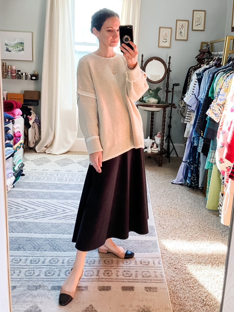 Or you can swap the satin skirt for a classic black circle skirt instead! Wearing it with an oversized beige sweater and neutral shoes is comfortable and elegant.
