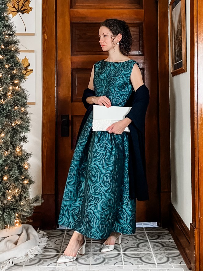 #5. Need a look for an upscale event? An elegant green dress, cashmere wrap, feather handbag and jeweled heels are perfect for a formal party.