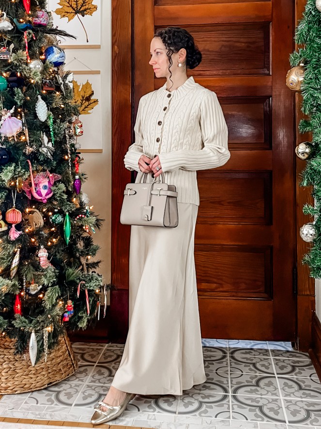 #4. A cream cable knit cardigan, satin skirt, gold leather flats and neutral handbag is simple, chic and comfortable.