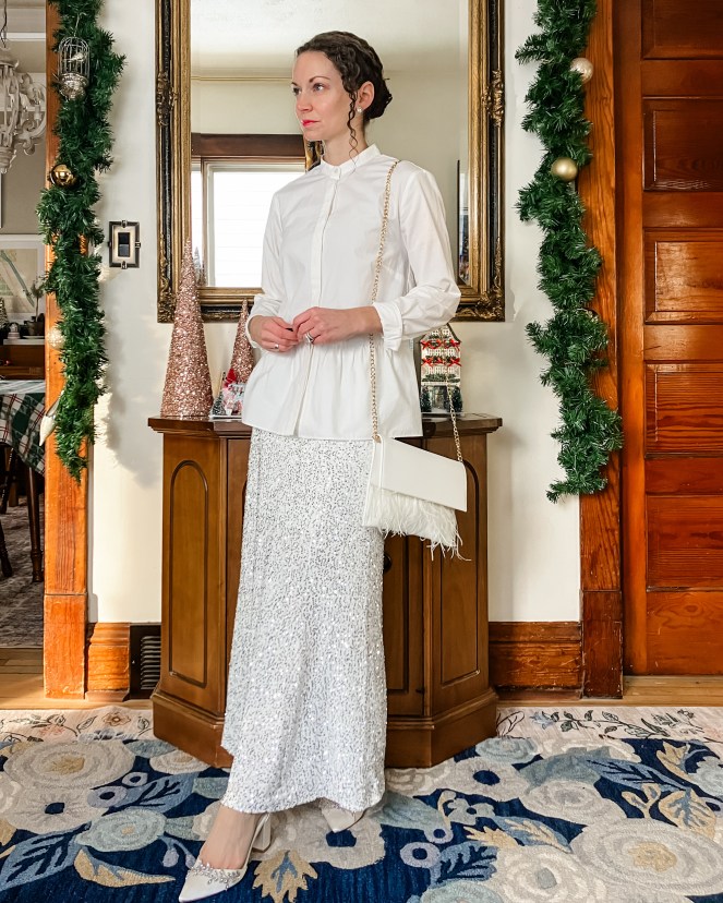 #3. Want a little sparkle for New Year’s Eve? A white button-up top, sequin skirt, white feather handbag and white jeweled heels looks amazing for this holiday!