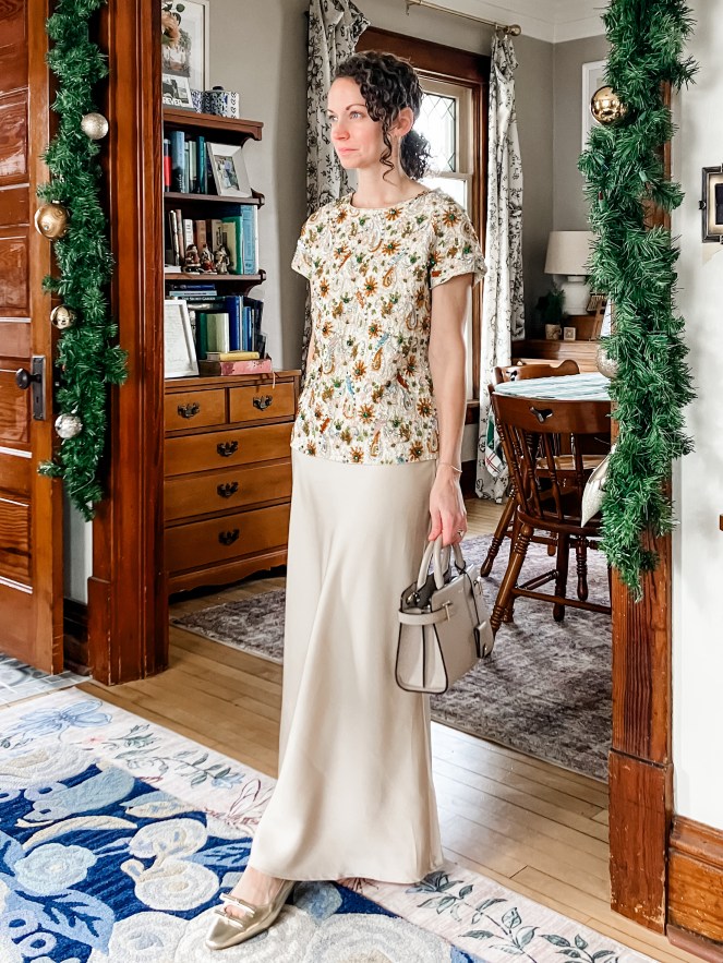 #1. A vintage beaded top (a festive top that’s already in your wardrobe works great, too), satin skirt, gold leather flats and neutral handbag make a simple and pretty look for New Year’s Eve!