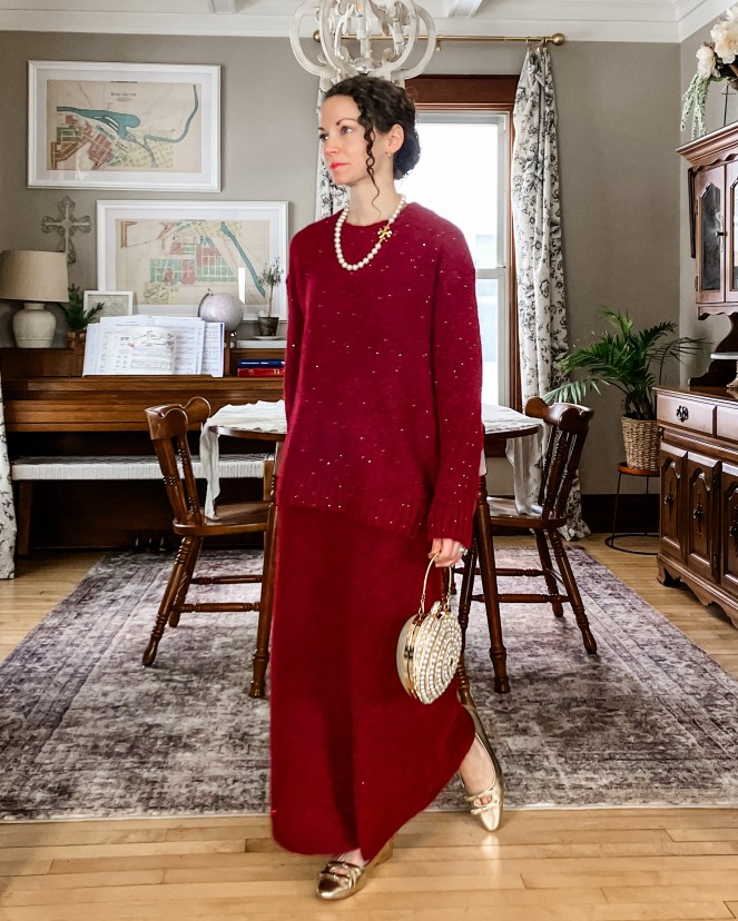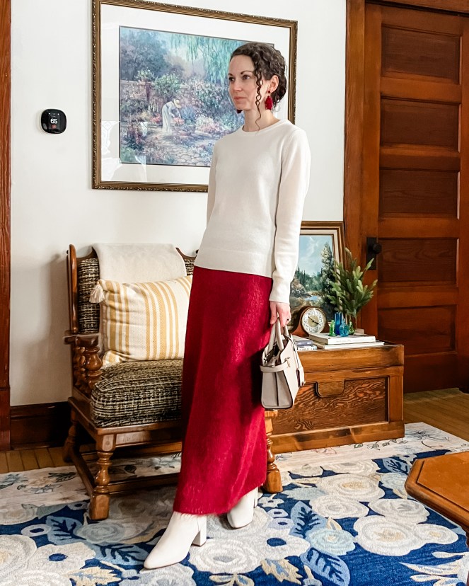 A cream cashmere sweater and burgundy sweater skirt is perfect for this holiday!