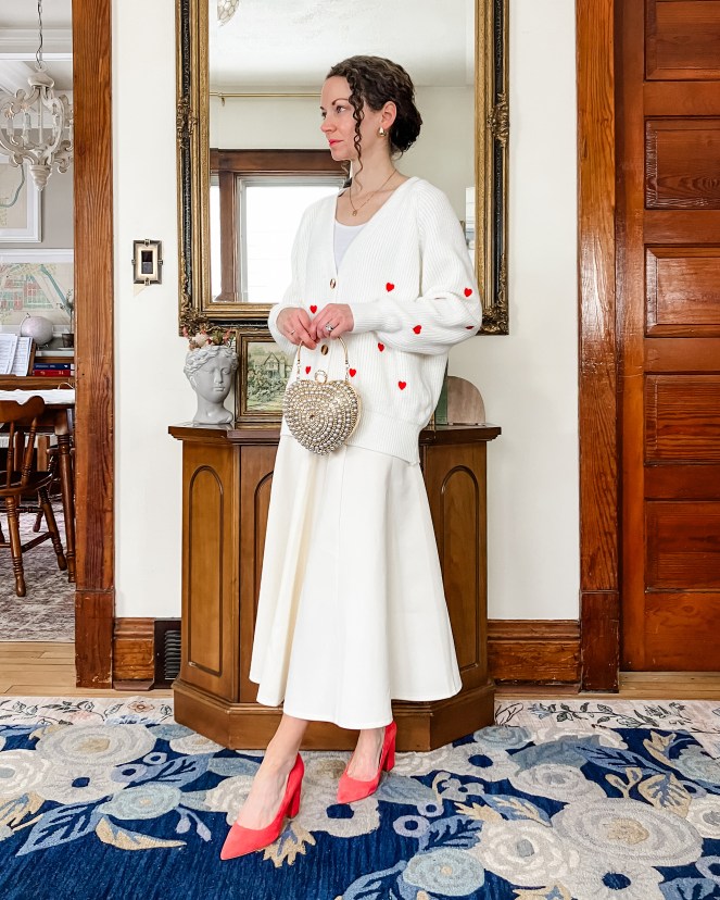 This look is definitely for a warmer climate! This embroidered heart cardigan is really cute with a cream skirt and red heels.