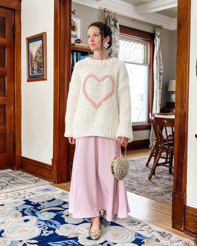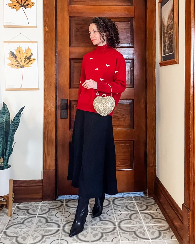 Another cold weather Valentine’s look! A cute heart sweater with a sweater skirt and boots is classic and elegant.