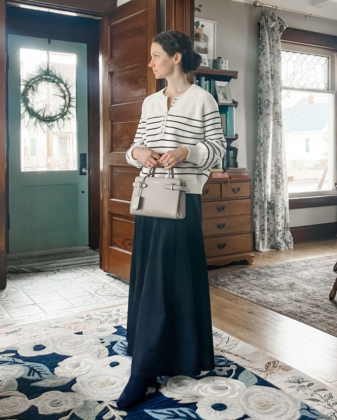 #4. This classic winter look featuring a stripe cotton sweater, maxi skirt and boots was a favorite last month!