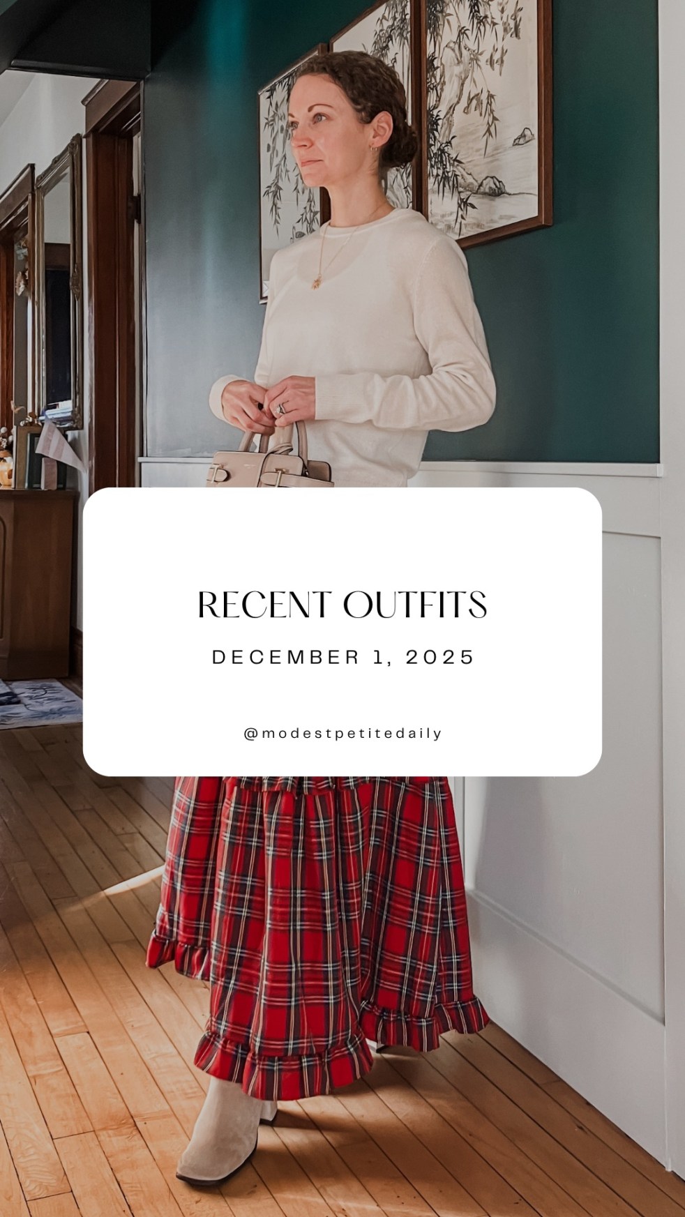 Happy December! I hope you all had a lovely Thanksgiving holiday. Here are a few outfits I wore recently. Left: I wore this look to church and Bible class Sunday morning. I love how this cream cashmere sweater looks with this pale pink maxi skirt, gold flats and taupe handbag (same bag, new color way-… Continue reading Recent Outfits (December 1, 2025)