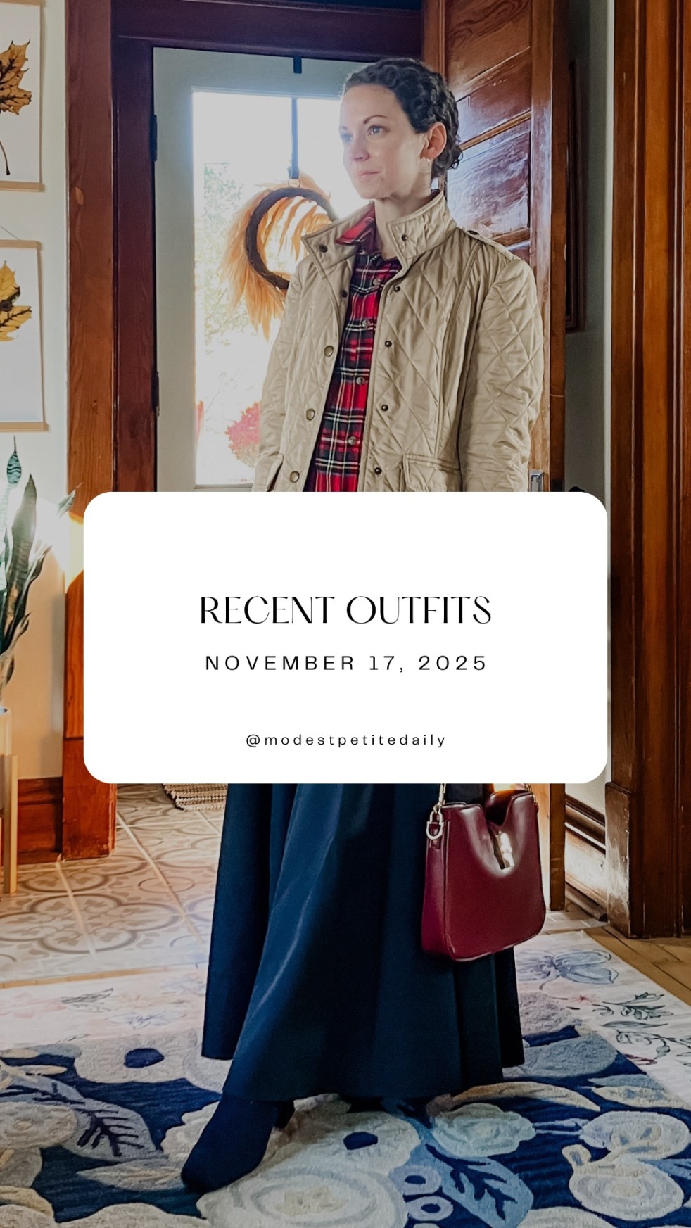 Happy Monday! Here are some outfits I wore recently. I primarily wore these to run errands, school pickup, church and a social event. Left: I wore a black cable knit cardigan over a striped dress, a maroon bag and waterproof black suede booties (similar, mine are old from Blondo) to church on Sunday. Middle: Monday… Continue reading Recent Outfits (November 17, 2025)